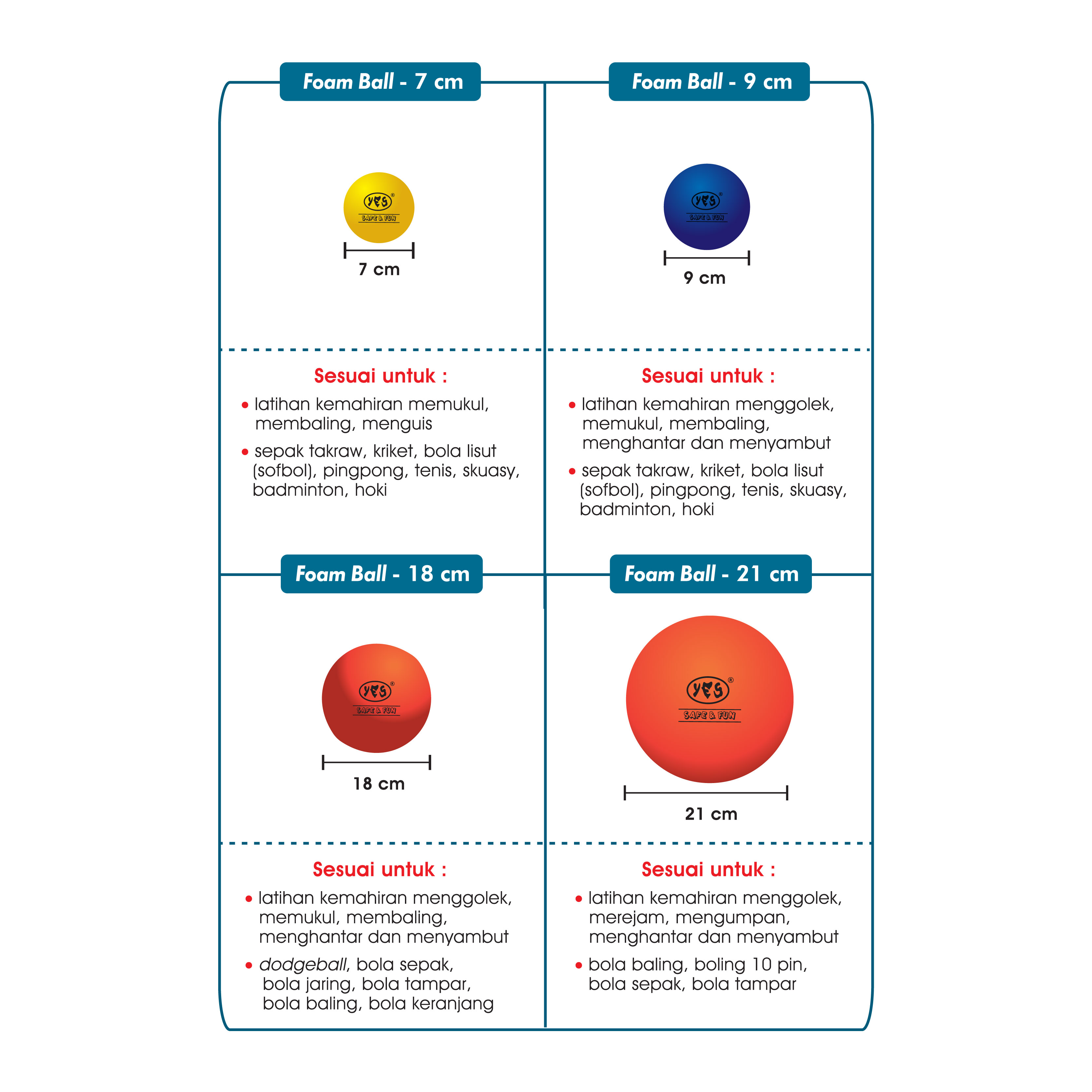 KUANTITI PER SET: 4 unit Foam Ball 9 cm sesuai untuk: