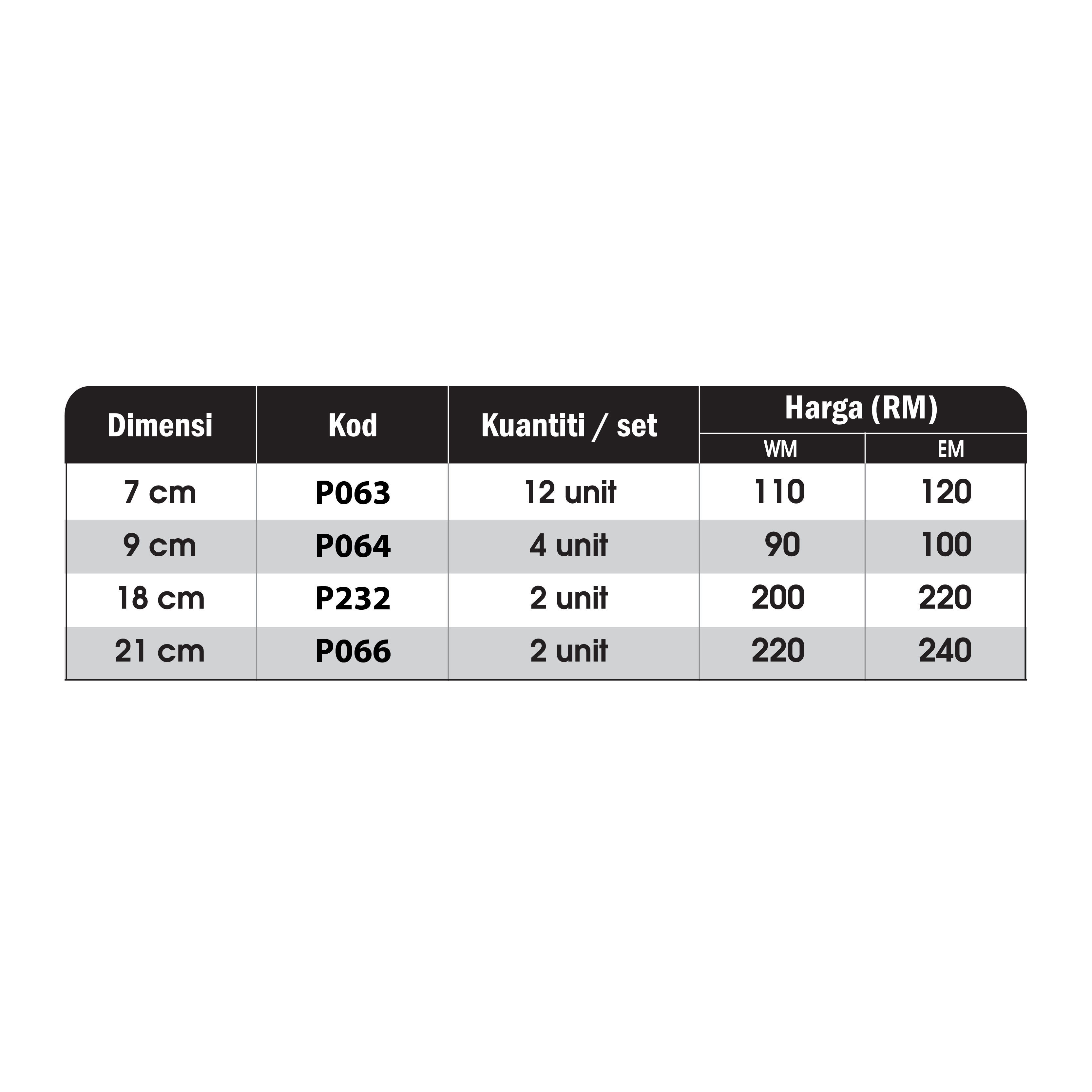9 cm – RM90.00 (WM) / RM100.00 (EM)